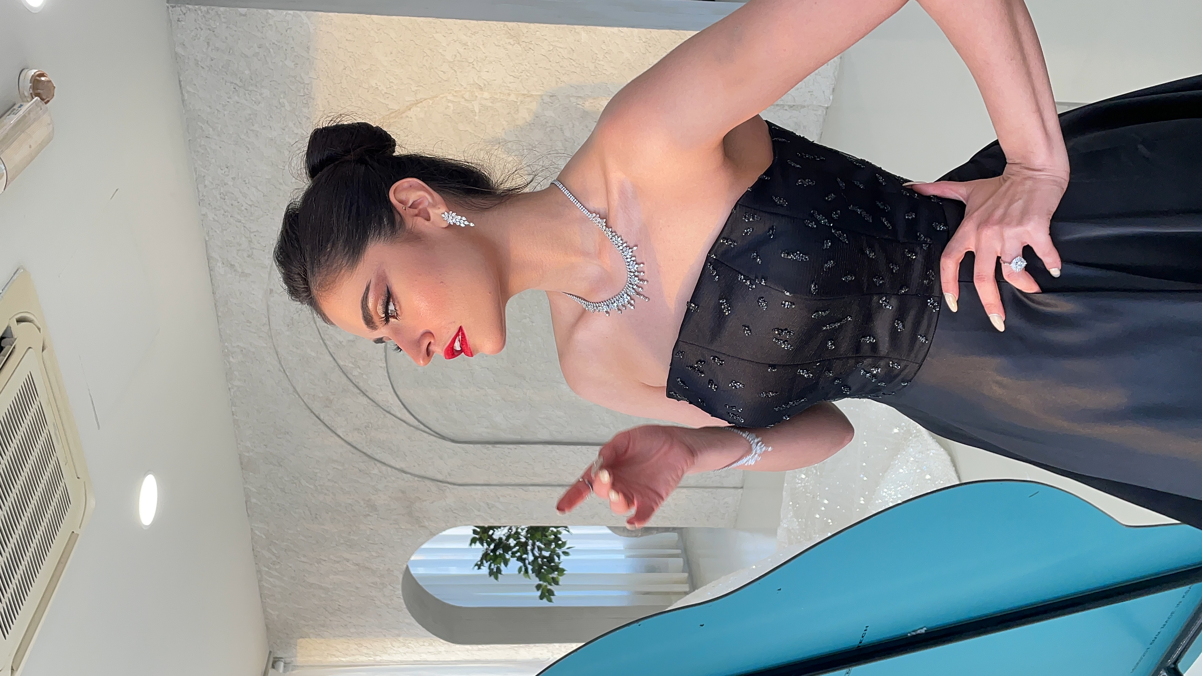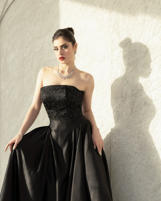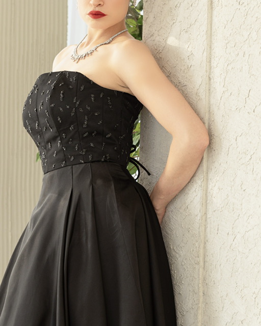 فستان حرير اسود بنمط كلاسيكي المكملات: تنورة جيبون قفازات