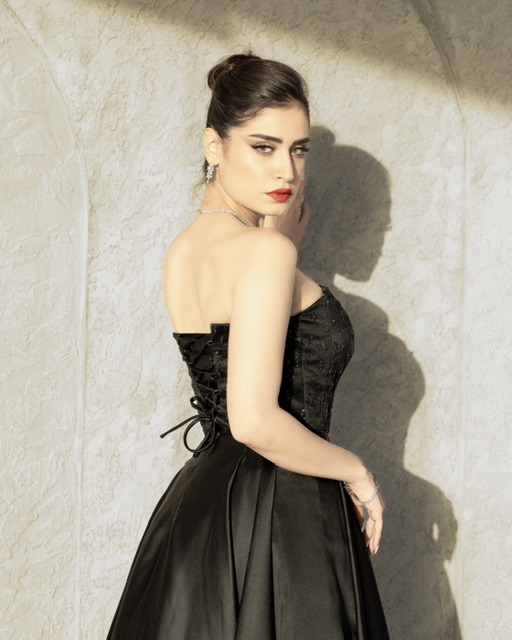 فستان حرير اسود بنمط كلاسيكي المكملات: تنورة جيبون قفازات