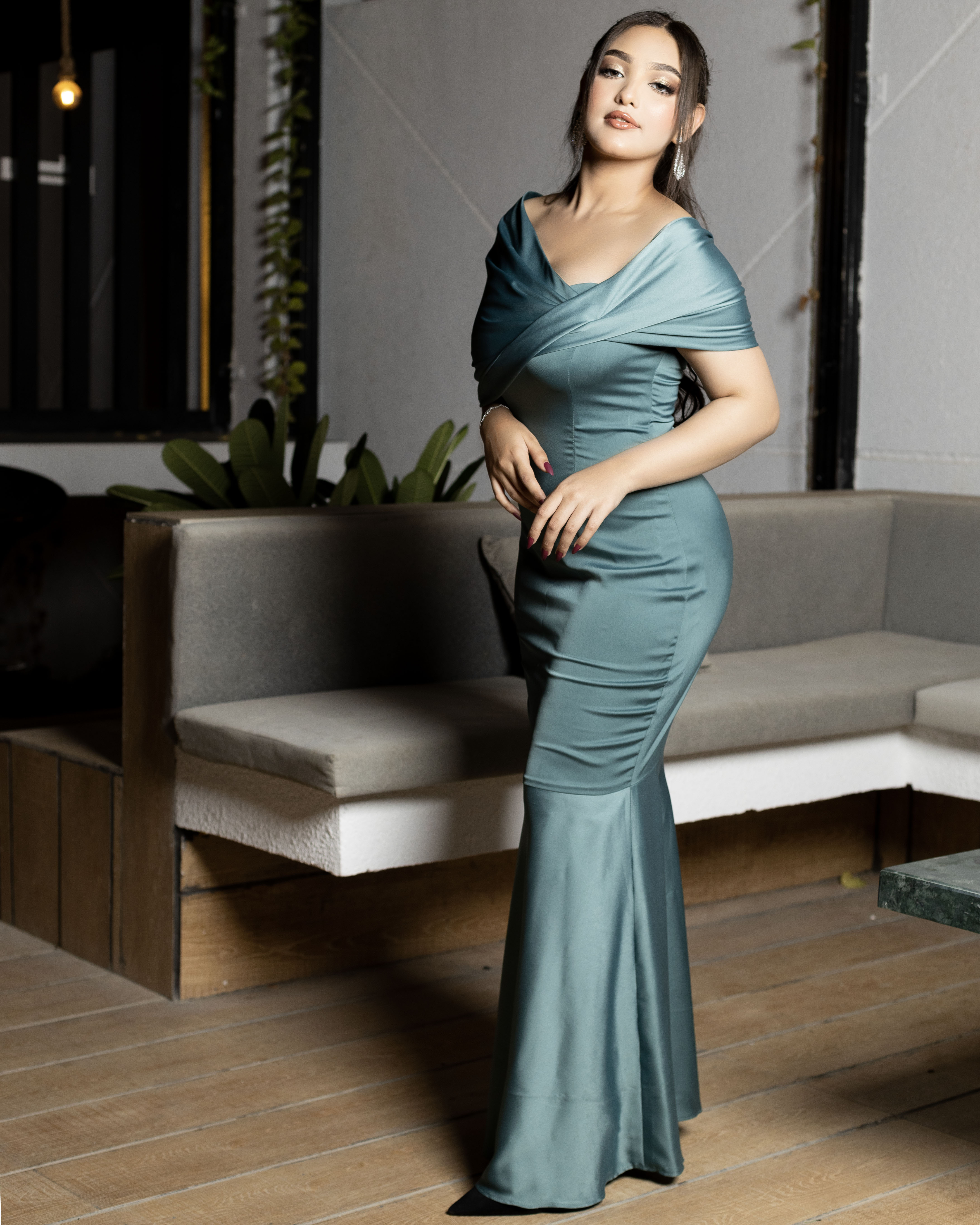 حرير ايطالي بقصة السمكة واكتاف منخفضة مائلة يمكن التحكم بها. الطول الصدر الخصر الفخذ